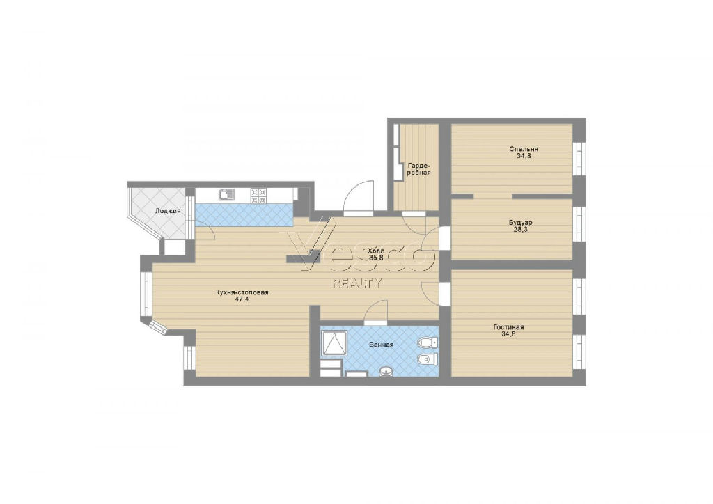 Пространство спланировано как: просторная гостиная 34,8 кв.м с окнами в благоустроенный двор, кухня-столовая 17,4 кв.м с лоджией, 2 спальни 34,8 и 28,3 кв.м, одна ванная комната, гардеробная, холл 35.8 кв.м с мозаикой в ручном исполнении от "Тиффани".